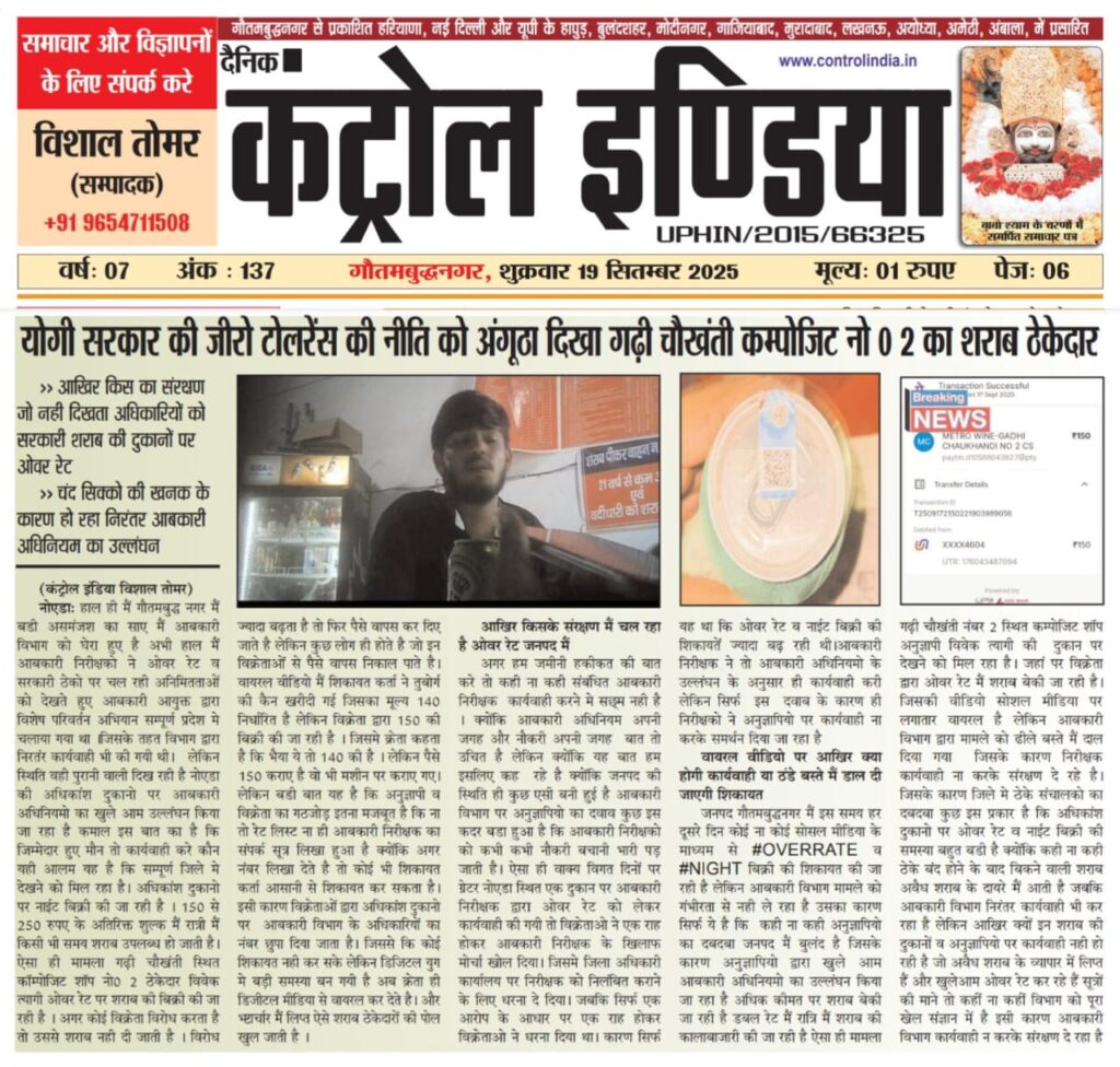 जनपद गौतमबुद्धनगर मैं इस समय हर दूसरे दिन कोई ना कोई सोसल मीडिया के माध्यम से #OVERRATE व #NIGHT बिक्री की शिकायत की जा रही है लेकिन आबकारी विभाग मामले को गंभीरता से नही ले रहा है उसका कारण सिर्फ ये है कि कही ना कही अनुज्ञापियो का दबदबा जनपद मैं बुलंद है जिसके कारण अनुज्ञापियो द्वारा खुले आम आबकारी अधिनियमो का उल्लंघन किया जा रहा है अधिक कीमत पर शराब बेकी जा रही है डबल रेट मैं रात्रि मैं शराब की कालाबाजारी की जा रही है ऐसा ही मामला गढ़ी चौखंती नंबर 2 स्थित कम्पोजिट शॉप अनुज्ञापी विवेक त्यागी की दुकान पर देखने को मिल रहा है। जहां पर विक्रेता द्वारा ओवर रेट मैं शराब बेकी जा रही है। जिसकी वीडियो सोशल मीडिया पर लगातार वायरल है लेकिन आबकारी विभाग द्वारा मामले को ढीले बस्ते मैं दाल दिया गया जिसके कारण निरीक्षक कार्यवाही ना करके संरक्षण दे रहे है। जिसके कारण जिले मे ठेके संचालको का दबदबा कुछ इस प्रकार है कि अधिकांश दुकानो पर ओवर रेट व नाईट बिक्री की समस्या बहुत बडी है क्योंकि कही ना कही ठेके बंद होने के बाद बिकने वाली शराब अवैध शराब के दायरे मैं आती है जबकि आबकारी विभाग निरंतर कार्यवाही भी कर रहा है लेकिन आखिर क्यों इन शराब की दुकानों व अनुज्ञापियो पर कार्यवाही नही हो रही है जो अवैध शराब के व्यापार में लिप्त हैं और खुलेआम ओवर रेट कर रहे हैं सूत्रों की माने तो कहीं ना कहीं विभाग को पूरा खेल संज्ञान में है इसी कारण आबकारी विभाग कार्यवाही न करके संरक्षण दे रहा है