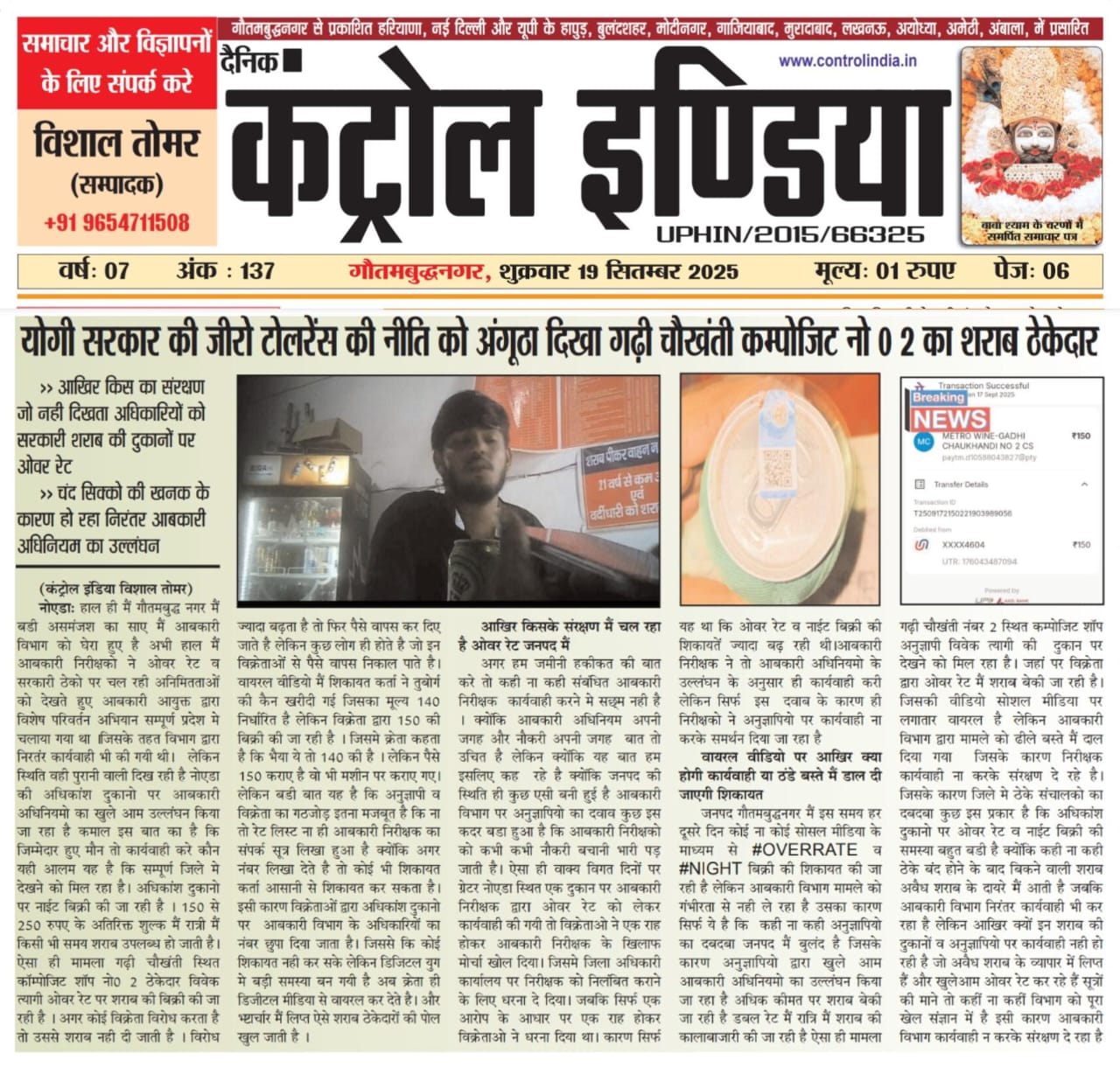 गौतमबुद्ध नगर मैं बडी असमंजश का साए मैं आबकारी विभाग को घेरा हुए है अभी हाल मैं आबकारी निरीक्षको ने ओवर रेट व सरकारी ठेको पर चल रही अनिमितताओं को देखते हुए आबकारी आयुक्त द्वारा विशेष परिवर्तन अभियान सम्पूर्ण प्रदेश मे चलाया गया था ।जिसके तहत विभाग द्वारा निरतंर कार्यवाही भी की गयी थी। लेकिन स्थिति वही पुरानी वाली दिख रही है नोएडा की अधिकांश दुकानो पर आबकारी अधिनियमो का खुले आम उल्लंघन किया जा रहा है कमाल इस बात का है कि जिम्मेदार हुए मौन तो कार्यवाही करे कौन यही आलम यह है कि सम्पूर्ण जिले मे देखने को मिल रहा है। अधिकांश दुकानो पर नाईट बिक्री की जा रही है । 150 से 250 रुपए के अतिरिक्त शुल्क मैं रात्री मैं किसी भी समय शराब उपलब्ध हो जाती है। ऐसा ही मामला गढ़ी चौखंती स्थित कॉम्पोजिट शॉप नो0 2 ठेकेदार विवेक त्यागी ओवर रेट पर शराब की बिक्री की जा रही है । अगर कोई विक्रेता विरोध करता है तो उससे शराब नही दी जाती है । विरोध ज्यादा बढ़ता है तो फिर पैसे वापस कर दिए जाते है लेकिन कुछ लोग ही होते है जो इन विक्रेताओं से पैसे वापस निकाल पाते है। वायरल वीडियो मैं शिकायत कर्ता ने तुबोर्ग की कैन खरीदी गई जिसका मूल्य 140 निर्धारित है लेकिन विक्रेता द्वारा 150 की बिक्री की जा रही है । जिसमे क्रेता कहता है कि भैया ये तो 140 की है । लेकिन पैसे 150 कराए है वो भी मशीन पर कराए गए। लेकिन बडी बात यह है कि अनुज्ञापी व विक्रेता का गठजोड़ इतना मजबूत है कि ना तो रेट लिस्ट ना ही आबकारी निरीक्षक का संपर्क सूत्र लिखा हुआ है क्योंकि अगर नंबर लिखा देते है तो कोई भी शिकायत कर्ता आसानी से शिकायत कर सकता है। इसी कारण विक्रेताओं द्वारा अधिकांश दुकानो पर आबकारी विभाग के अधिकारियों का नंबर छुपा दिया जाता है। जिससे कि कोई शिकायत नही कर सके लेकिन डिजिटल युग मे बड़ी समस्या बन गयी है अब क्रेता ही डिजीटल मीडिया से वायरल कर देते है। और भ्र्ष्टाचार मैं लिप्त ऐसे शराब ठेकेदारों की पोल खुल जाती है ।